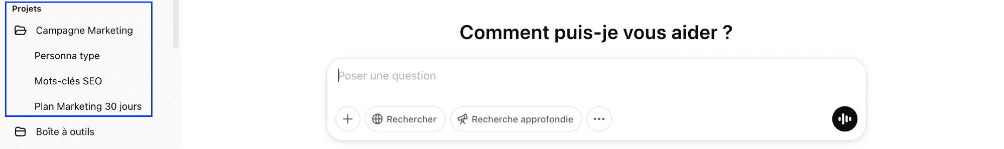 8️⃣ Depuis la barre latérale gauche, vous avez accès à une vision globale des différents Chats de votre projet.