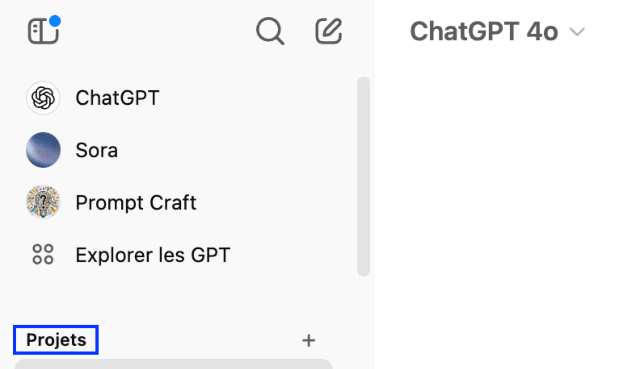 1️⃣ Ouvrir ChatGPT et se rendre dans l’onglet "Projets" dans la barre latérale gauche de votre écran.
